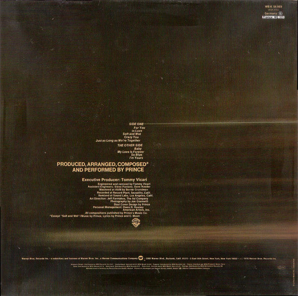 On his debut album, For You, Prince shows exceptional skill for arranging and performing mainstream urban R&B and funk, but his songwriting remains conventional. Only on the mildly racy "Soft and Wet" does he demonstrate a personal touch, but the song is still more of a promise than a fulfillment. While For You isn't a bad record, it is merely a pleasant one, and it offers very little indication of his staggering talents.
